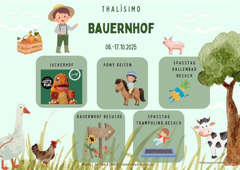 Wir besuchen verschiedene Höfe, füttern Tiere, erleben das Landleben hautnah und gehen sogar Pony reiten. Dazu gibt es abwechslungsreiche Spasstage: ein Besuch im Trampolino, ein Ausflug ins Schwimmbad – und vieles mehr!